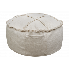 Αυτό το στρογγυλό πουφ είναι χειροποίητο σε βαμβακερό καμβά φυσικού χρώματος με μερικά φουντωτά κρόσσια στην κορυφή που σχηματίζουν τις γραμμές του επιτραπέζιου παιχνιδιούΧρησιμεύει ως επιτραπέζιο παιχνίδι τόσο για τα παιδιά όσο και για τους μεγάλους..