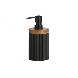 Αντλία για σαπούνι κατασκευασμένη από μαύρη πολυρεζίνη και φυσικό ξύλο ακακίας. Στην επιφάνεια διαθέτει ανάγλυφες κάθετες γραμμές και αδρή υφή.Το ξύλο της βάσης είναι επεξεργασμένο για να αντιστέκεται στην υγρασία του μπάνιου..