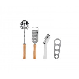 Το σετ αποτελείται από μία κουτάλα σπαγγέτι με τρύπες, έναν τρ΄φτη με ξύλινη λαβή, μία λαβίδα και ένα μετρητή ποσότητας.Υλικό: Ανοξείδωτο ατσάλι/ΞύλοΧρώμα: Ασημί/ΦυσικάΔιαστάσεις: 25 x 35 x 7cm (συσκευασίας)Συντήρηση: Πλύσιμο με σαπούνι και νερό. Χρε..